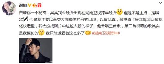 今天中午,谢娜发微博称,跨年将由张杰代表、以百变大咖模仿的形式出现,“台里请了好莱坞团队帮我化妆造型,我会扮成图片中这位大咖的样子,他会唱三首歌,第二首很嗨的歌其实是我模仿的 我只能透露着这么多了。”