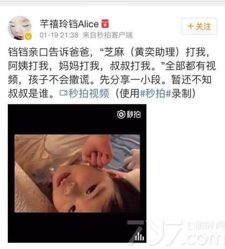 1月19日晚,黄毅清以微博“芊禧玲铛Alice ”曝视频,视频中,铛铛对着镜头称被打脸,在黄毅清的逼问下又回答称是“妈妈”打的,并用手指向脸部。黄毅清还写道:“孩子不会撒谎。”