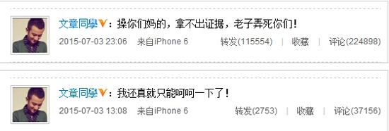 当日下午,文章发布微博:“我还真就只能呵呵一下了!”回应此事。之后事件持续发酵,当晚,文章在微博上大爆粗口:“操你们妈的,拿不出证据,老子弄死你们!”令人大跌眼镜。