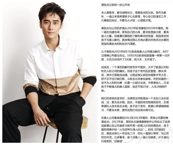 29日,疑似蒋劲夫的父亲蒋春来开通了个人微博,并随后发表了一封近五千字长文公开信,完整披露了唐人伪造合同、侵占艺人收入的内幕,甚至还提到了其违约扣蒋劲夫片酬155万元,企图抹黑蒋劲夫等行为,故解约是必然的选择。