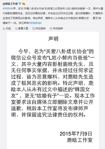 7月9日,鹿晗工作室在微博发布声明,称其为恶意爆料,对鹿晗造成了极其恶劣的影响。“今早,名为‘关爱八卦成长协会’的微信公众号发布‘L姓小鲜肉当爸爸’一文,其中大量内容影射鹿晗先生,且无任何事实依据,并未经过任何求证过程,皆为恶意爆料,对鹿晗先生造成了极其恶劣的影响。特此声明,鹿晗本人从未有过文中描述的‘韩国女友’ ,更无‘结婚有子’一说。”