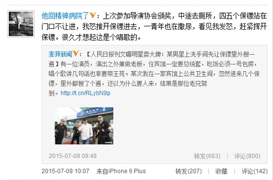 7月9日,党报《人民日报》发表一篇社论文章,提到出名是文艺界特征,为了现场秩序而采取安保措施无可厚非,但有些明星却摆谱、耍大牌。随后高群书导演也转发消息并透露此前参加颁奖礼,四五个保镖竟守在厕所门口不许任何人进去,真是岂有此理。