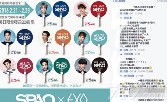 未料,近日,EXO近期担任某服饰品牌的代言人,EXO代言的韩服饰品牌SPAO台湾方将在21日举办赠送应援扇的活动,明明就有9位成员,但只出现了8位,唯独缺少张艺兴,让粉丝大感傻眼,涌入官网抱怨,对此,台湾SPAO方表示“这方面我们不太清楚。”此前,2015年底就曾发生预告回归的15秒影片,也是唯独少了张艺兴。
