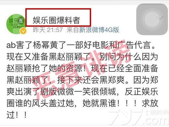 据悉,该营销号此前发布了一条微博,称AB害得杨幂又错过了一部好电影和广告代言,现在有准备开黑赵丽颖,就是因为赵丽颖抢了Baby的资源,此后还会将黑手伸向郑爽,并得出结论:反正娱乐圈谁风头盖过她,她就黑谁!