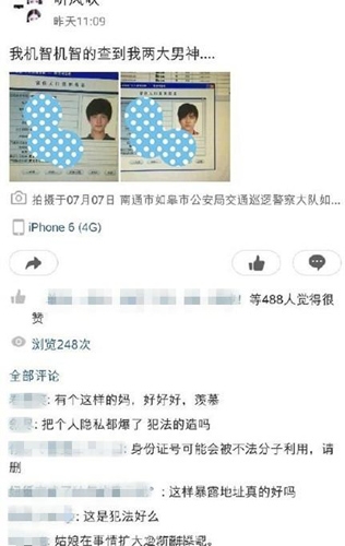 在网上曝光的疑似该女子所发状态截图中,李易峰、杨洋的个人信息被从电脑中拍下并传至网络,其中包括二人的身份证号、曾用名、户籍所在地等隐私。该女子还留言称:我机智机智的查到我两大男神。而下方的照片说明则显示,两张照片拍摄于南通市如皋市公安局交通巡逻警察大队。