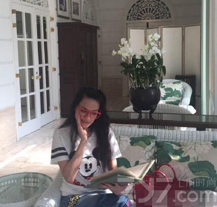 香港女星舒淇近日在自己的微博上晒出假期照片,新照中的她身穿着幼稚的米老鼠T恤,戴着红框眼镜,满面笑容,似乎心情大好,看上去就像个大学生。