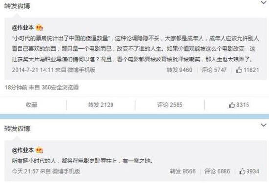 7月6日晚11点左右,网络红人“作业本”突然发出一条微博,称“所有挺小时代的人,都将在电影史耻辱柱上,有一席之地。”似乎在嘲讽看《小时代》的观众以及导演郭敬明。随后,郭敬明转发此条,30分钟后他又转发了一条“作业本”之前发的为《小时代》辩白的微博,在去年的7月份,“作业本”还声称“‘小时代的票房统计出了中国的傻逼数量’,这种论调隐隐不妥,大家都是成年人,成年人应该允许别人看自己喜欢的东西”。如此前后矛盾也引人发笑。