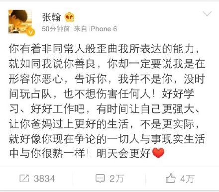 张翰微博曝出后,有网友为郑爽不服,认为张翰不顾前女友感受,毕竟许晴是跟郑爽发生矛盾不合。稍后的21点07分,张翰更新微博,回应网友质疑,称:“你有着非同常人般歪曲我所表达的能力,就如同我说你善良,你却一定要说我是在形容你恶心,告诉你,我并不是你,没时间玩占队,也不想伤害任何人!好好学习、好好工作吧,有时间让自己更强大、让你爸妈过上更好的生活,不是更实际,就好像你现在争论,一切人与事现实生活中与你很熟一样!明天会更好!”对于网友的质疑,张翰方面工作人员表示:“我们不做任何回应!谢谢关心!”