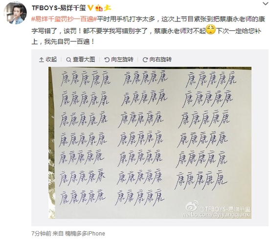 日前,国内新生代偶像鲜肉团体TFboys前往台北录制综艺节目《康熙来了》,有眼尖的网友发现三人赠送给主持人蔡康永的专辑签名写错了前辈的名字,在网上引发了热议。随后易烊千玺在微博晒出了自罚图,并向蔡康永道歉。
