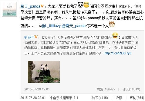 昨天晚上,葛天本人转发了这条微博,大方回应:“大家不要爱特我了[熊猫][汗]借国宝圆圆这事儿回应下,假怀孕这事儿真真是没有啊,我从气愤都转无奈了。。。以后对待网络谣言真心希望大家理智冷静,还有。。。虽然都叫panda但我人真没国宝圆圆那么机智的。。。