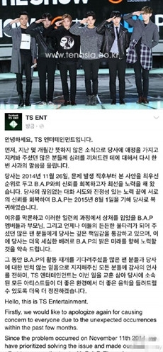 另外,TS娱乐公司方面还表示"2014年11月26日,问题发生之后,本社尽了我们最大努力来恢复与B.A.P之间的信任,在TS不断的努力终于恢复了我们之间的信任,在其过程中受到伤害的B.A.P成员和其父母们,以及一直支持B.A.P的粉丝们,通过你们本社深感我们的责任,以后一定会为了美好的未来努力的。"