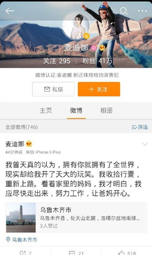 新疆美女麦迪娜刚发分手微博:“我曾天真的以为,拥有你就拥有了全世界,现实却给我开了天大的玩笑。我收拾行囊,重新上路。”