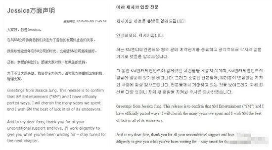 随后,Jessica发布公开声明:“大家好,我是Jessica。在于SM公司协商后我们决定为了各自的发展终止合约关系。我很珍惜这些年在SM公司的时光,也希望SM公司越来越好。感谢粉丝们对我一如既往的支持。为了不让大家失望,我会尽全力努力,请大家支持重新出发的我,谢谢大家。”
