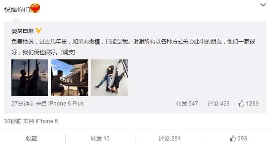 邓超的好友俞白眉发文称“负责地说,过去几年里,如果有嫩模,只能是我。谢谢所有以各种方式关心此事的朋友,他们一家很好,我们俩也很好。”孙俪则转发了俞白眉的微博,称“祝福你们”,疑似对该事件进行回应,否认邓超出轨。