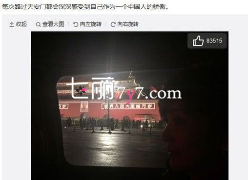 1月8日15:17,香港演员赵雅芝在微博晒出一张赵雅芝行车路过长安街时从车内看到的北京天安门夜景图,虽然光线比较暗,图片右方仍依稀可见女神的侧脸,赵雅芝同时留言:“每次路过天安门都会深深感受到自己作为一个中国人的骄傲。”