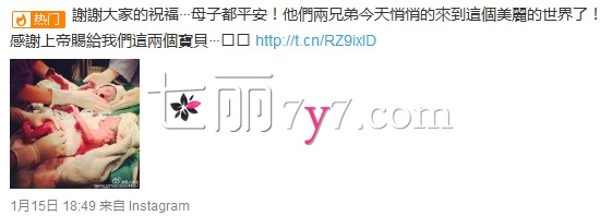 2015年1月15日晚上7点范玮琪的微博相继也晒出了两位小家伙(大小熊猫)的出生照,粉嫩粉嫩的小小个,让人想要嗬护在手掌心。