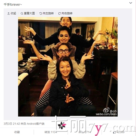 大S产后甚少在公众视线中出现,但昨日晚上九点四十左右,小S突然在微博晒出一张姐妹聚会的合照。照片中是已经成为了辣妈大小S和阿雅还有许久不见的范晓萱,四人分别穿着舒适家居服,排成一竖排并做出千手观音的动作,小S在微博配文中写道:“千手forever~”。闺蜜聚会十分热闹愉快。