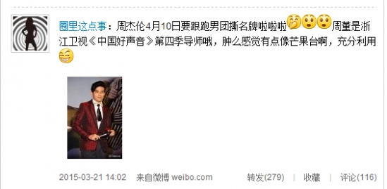 周杰伦自《最强大脑》开始就与浙江卫视有着良好的合作关系,此前已经确定担任《中国好声音》第四季的导师,日前又传出将会加盟奔跑吧兄弟第二季的录制。虽然节目组称不知情,但是凭借周董与浙江卫视的交情也不是不可能。