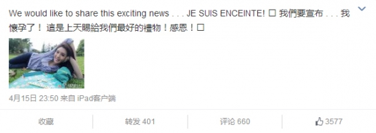 今天,香港女星官恩娜在自己微博上大方表示:"我们要宣布,我怀孕了!这是上天赐给我们最好的礼物!感恩。"据悉,官恩娜于今年2月结婚,男友是中法混血的帅气医生,官恩娜在微博上大方公开自己的怀孕消息,可见对于即将当妈妈充满期待!