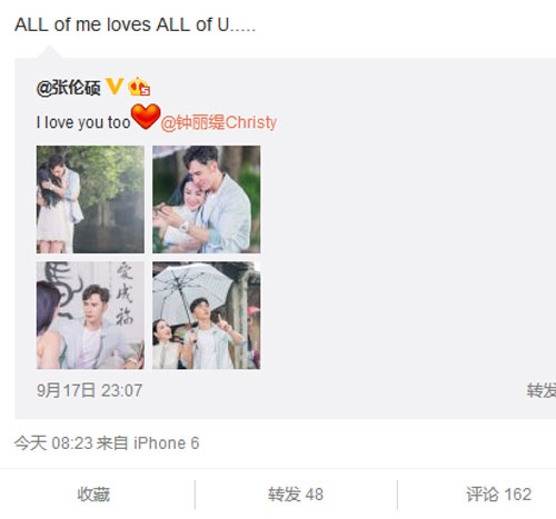 今日(9月18日),44岁单亲星妈钟丽缇与33岁小鲜肉张伦硕再次高调晒爱。先是张伦硕在微博上传多张与钟丽缇的亲密照,附文“I love you too.”随后钟丽缇转发又表白称“ALL of me loves ALL of U”。简直腻死人。
