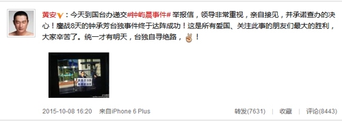 10月8日下午,台湾歌手黄安携实名举报信赴国台办举报涉嫌鼓吹“台独”女子钟屿晨,将整理的举报材料交给国台办,并高举“我是反台独 不是反台湾”的手牌,澄清自己并非反台湾。随后黄安微博还称“统一才有明天,台独自寻绝路”