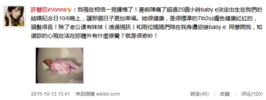许慧欣本人更是很激动地表示:“我现在相信一见钟情了!产前阵痛了超过25个小时,baby e决定出生在我们的结婚纪念日10/6晚上,让那个日子更加幸福,宝宝很健康......."