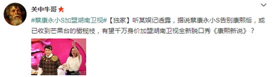 今天下午,台湾老牌综艺《康熙来了》两位主持人蔡康永、小S纷纷宣布告别节目,随后,《康熙》片方回应,还在挽留中,具体情况尚不知晓。但根据某娱记透露,蔡康永与小S此次告别《康熙》后,或是因为芒果台抛出橄榄枝,有望千万身价加盟湖南卫视全新脱口秀《康熙新说》。对此,目前,双方都还未做出任何回应。