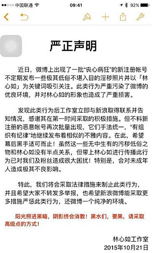 林心如工作室的声明中,措辞强硬,痛斥此举“丧心病狂”,更强调林心如与“无中生有的污秽低俗之物”没半点关系,将采取法律行动制止这类行为,并意有所指地表示:“黑水们,要黑,请采取高级点的方式!”