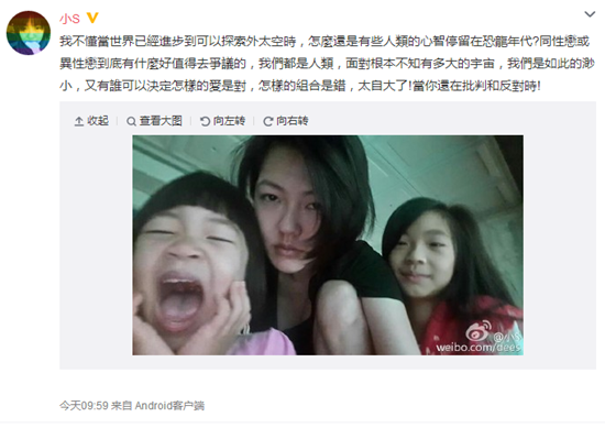 29日,小S更新微博批评反同性恋的人“太自大”。她写道“我不懂当世界已经进步到可以探索外层空间时,怎么还是有些人类的心智停留在恐龙年代?同性恋或异性恋到底有什么好值得去争议的,我们都是人类,面对根本不知有多大的宇宙,我们是如此的渺小,又有谁可以决定怎样的爱是对,怎样的组合是错,太自大了!当你还在批判和反对时!”