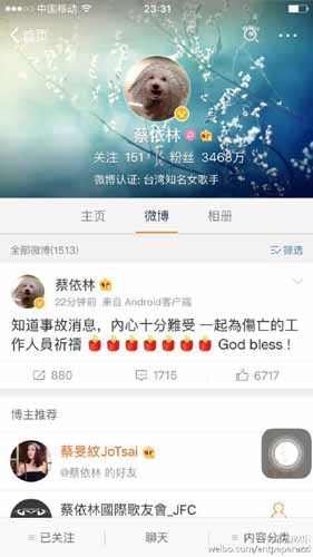 对于此次事故,蔡依林也非常的难受,并通过微博为伤者祈福,称:“知道事故消息,内心十分难受,一起为伤亡的工作人员祈福! God bless !”