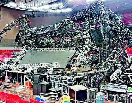 据台湾媒体报道,蔡依林(Jolin)本周六(31日)预定在广西南宁举行“蔡依林2015 PLAY世界巡回演唱会”,现场舞台近日已几乎准备搭建完成,不料,该舞台29日下午5点多,多条大型钢铁结构的灯架突然倒塌砸下来,现场一片混乱,造成 1名工人意外死亡,且有13名工人受伤。Jolin人还没到现场,本来预计今日(30日)抵达,若是在演唱会当天才发生倒塌,后果更是不堪设想。经纪人表示正在了解状况,是否取消演唱会,仍要看舞台修复状况。