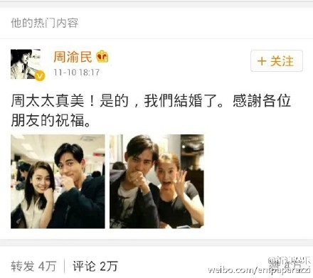 周渝民宣布结婚了,妻子喻虹渊资料背景曝光,,国民男神周渝民今天下午在微博突然宣布自己结婚了,晒出登记注册时的合影,手中的婚戒抢镜,并且附文“周太太真没,是的,我们结婚了,感谢各位的祝福”