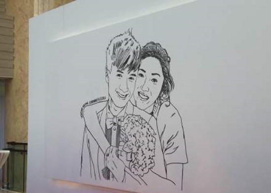 而背后古氏夫妇的画是古巨基根据与太太的婚照,以马克笔花了将近八小时亲手绘画而成,充满心思和爱意!