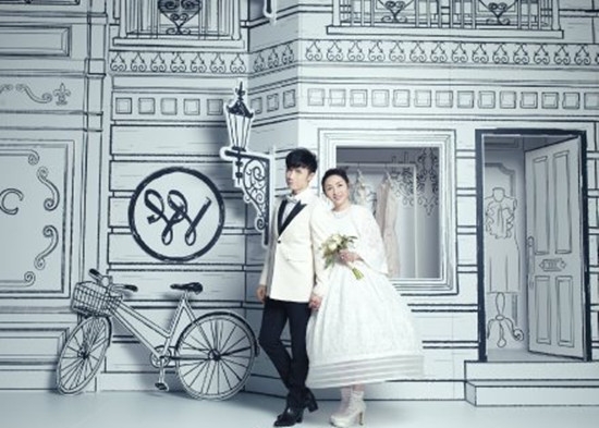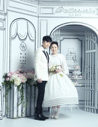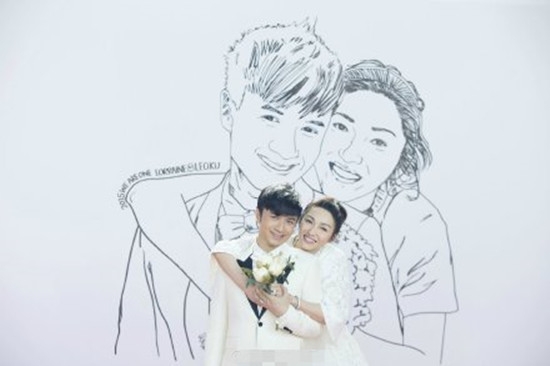 古巨基去年与爱妻Lorraine在拉斯维加斯注册结婚后,今天于中环四季酒店举行结婚酒会。为了给太太一个难忘的婚礼,除喜帖喜饼外,结婚酒会现场一幅手绘巨型背板,基仔根据与太太的婚照,以marker笔花了将近八小时亲手绘画而成,充满心思和爱意。