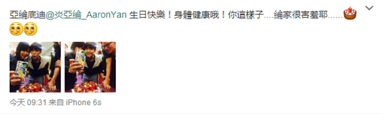 11月20日是炎亚纶的生日,郭品超在微博中晒出为炎亚纶庆生的照片。照片中的炎亚纶大方同一旁的人合影,笑容亲切自然。可亮点却是……他左手握住郭品超的手腕,害得一旁的品超好羞涩,还艾特炎亚纶:“亚纶底迪生日快乐!身体健康哦!你这样子,纶家很害羞耶。”