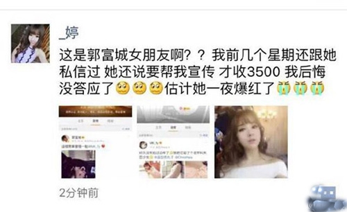 随后有网友爆出郭富城女友因和天王恋情曝光以后狂删自己微信里面的好友,男性好友几乎全部删光,因为方媛在淘宝上卖包,有网友称曾找方媛推广包包,称方媛才收费3500元。