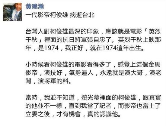 据台媒报道,金马影帝柯俊雄日前传出肺癌复发,紧急送入加护病房,插管昏迷十多天,虽柯太太表示他一度恢复意识,状况稳定,然而有媒体报道报导,柯俊雄昨(12/6)仍不敌病魔,因肺癌病逝,享寿70岁。据院内相关人士透露,柯俊雄昨天深夜10点多宣告不治,11点左右遗体即送往三总怀德厅,凌晨时分由医院送至第一殡仪馆。