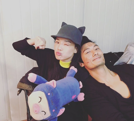 由余文乐彭于晏主演的《悟空传》正在热拍,12月7日晚,舒淇通过微博晒出探班照,余文乐将头靠在舒淇肩膀上,舒淇戴着可爱的俏皮帽,嘟嘴卖萌,另外一张是和彭于晏合影,两人比V卖萌,展现娇羞小女人模样,非常的可爱。