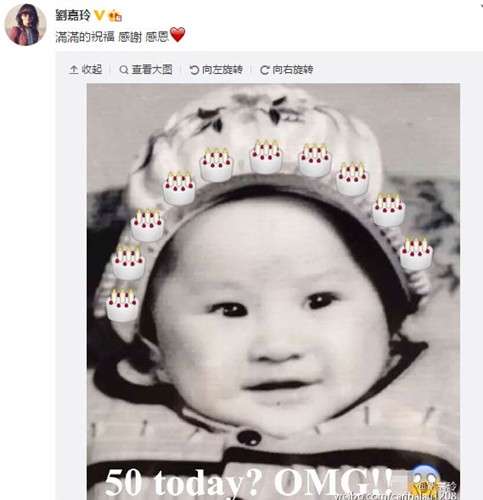 12月8日,刘嘉玲在微博晒出自己的一张童年照,原来这天是她50岁生日。照片中,幼年时期的刘嘉玲带着婴儿肥,眼睛炯炯有神很是可爱。她在微博写道:“满满的祝福,感谢,感恩。”照片底部,刘嘉玲还P上了文字:“50today?OMG!!(今天50岁啦?天啊!)”旁边的“惊悚”表情十分逗趣。