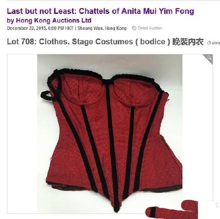 梅艳芳内衣将被拍卖,标榜天价被网友怒骂没人性,近日,梅艳芳遗产信托公司将其3000多件遗物放上网拍卖,含有内衣和新秀冠军奖座,起步价港币100-10000元不等,黄秋生微博怒斥“放过她的内衣吧,给艺人最后一点尊严。”譚耀文呼吁停止拍卖“遗产公司还有人性吗?”