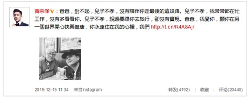 12月15日中午,香港演员黄宗泽在微博中晒出一张与父亲的合影,透露了父亲病逝的消息。黄宗泽在微博中自责的写道:“爸爸,对不起,儿子不孝,没有陪伴你走最后的这段路。儿子不孝,我常常都在忙工作,没有多看看你。儿子不孝,说过要跟你去旅行,却没有实现。爸爸,我爱你,愿你在另一个世界开心快乐健康,你永远住在我的心里,我们下一辈子再做父子!”
