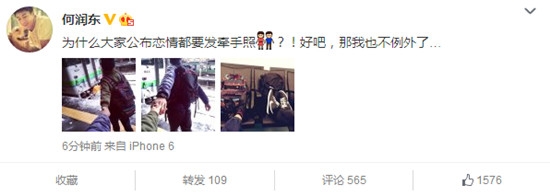 今日(17日)下午,何润东公布恋情,晒和女友牵手照超甜蜜。并写道:“为什么大家公布恋情都要发牵手照?!好吧,那我也不例外了…”