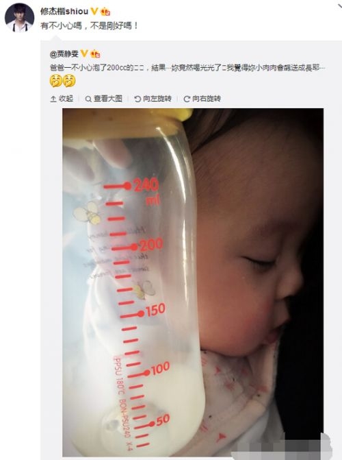 贾静雯晒小女儿完美侧颜,今日下午,贾静雯在微博晒出女儿的一张侧脸照,照片中小宝贝睫毛长长,成功抢镜。贾静雯称小女儿把爸爸泡的奶全都喝光,修泽楷则转发称刚刚好,网友调侃称这是高级秀恩爱啊!
