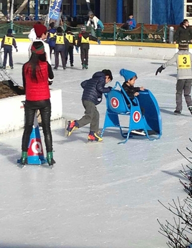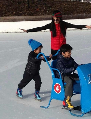 昨日,有网友晒出张柏芝带着两个儿子滑冰照片,照片中,张柏芝身穿红色上衣伸展双臂,教两个孩子滑冰,而Lucas和Quintus则互相坐在车上推对方前进,画面十分有爱。