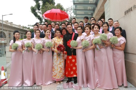 胡杏儿大婚,新郎迎亲与伴娘团合影.新郎迎亲仪式正在进行,两人穿着传统服饰和伴郎伴娘一起合影,随后准新人会在香港进行注册仪式.