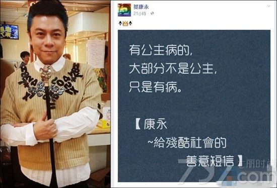 据台湾媒体报道,7日,蔡康永在社交网站上批评有“公主病”的人,称她们大部分都不是公主,“只是有病”。