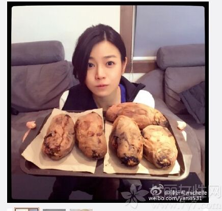 1月15日电今日下午,陈妍希通过微博晒出多张自己与美食的合照。照片中,陈妍希端着装有五个地瓜的托盘,看起来十分可爱