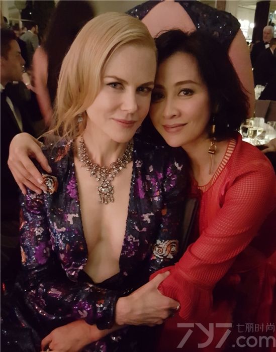 1月13日晚间,刘嘉玲通过微博晒和妮可基德曼的合影,并写道:“拥抱女神!”照片中,刘嘉玲身穿一袭喜庆的红色长裙,化着精致的妆容,和妮可基德曼头挨头亲密搂抱,妮可基德曼穿着深V长裙,非常的性感,大秀迷人的事业线。