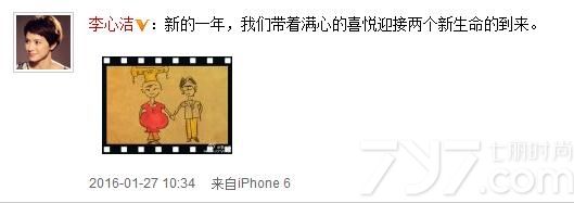 1月27日,女星李心洁在微博发文宣布怀上了双胞胎:“新的一年,我们带着满心的喜悦迎接两个新生命的到来。”并附上了小两口的手绘漫画。漫画中的李心洁穿着喜庆的红色连衣裙,肚子大大凸出。