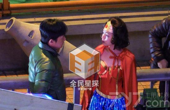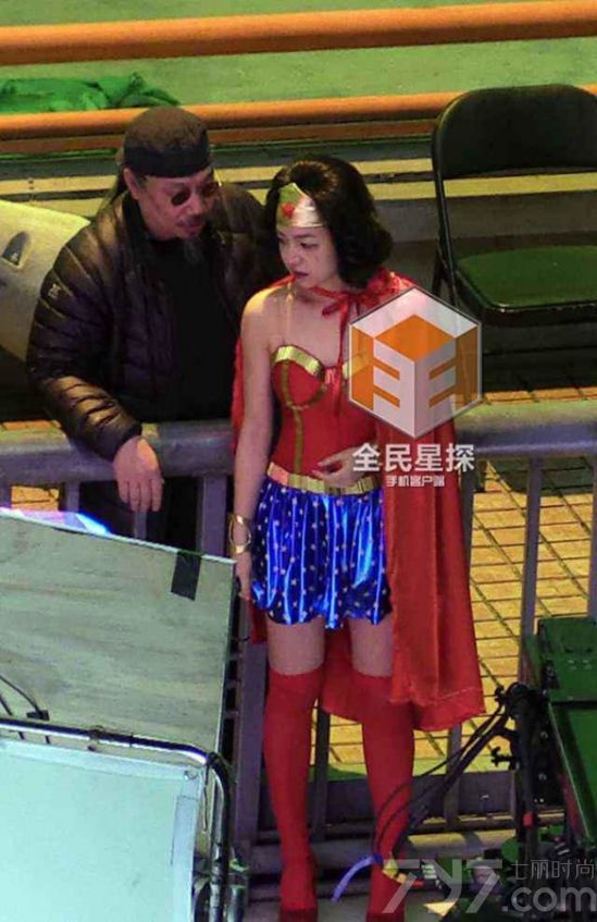 陈妍希的造型颇为前卫,身穿肚兜低胸红色超人装,下身穿着蓝色短裙,戴着金色发箍。